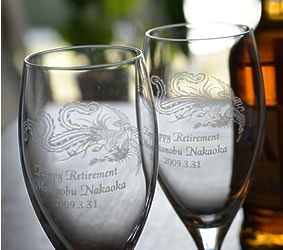 クリスタルのビールグラスに不死鳥をイメージした柄をエッチング。 細かな羽模様の精密画エッチングや凝ったデザインは 他のお店で買うことのできない秀逸の柄です。退職のお祝いや長寿を願った贈り物としてどうぞ